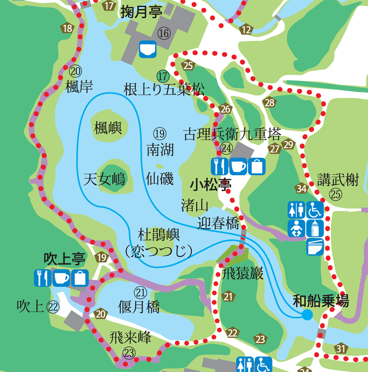 不老不死の秘薬を持つ仙人が住むとされるの蓬莱島は、栗林公園では仙磯(せんぎ)と呼ばれる岩島である。岩だけでどこまでも続く壮麗な山並みを表現しており、和船でのみ詳細が分かる見逃せないポイントだ。