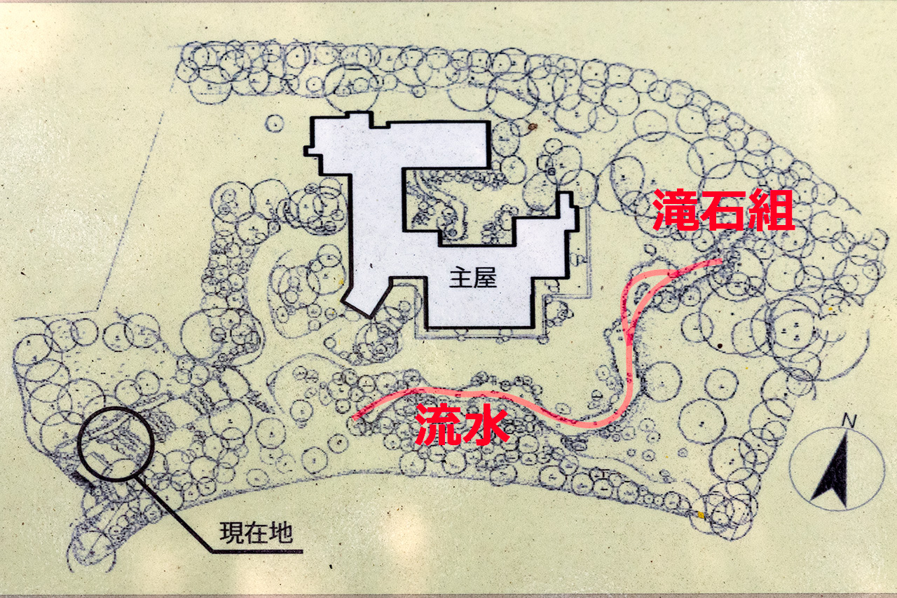 皆春荘の案内図。滝石組と流水の位置関係を分かりやすいように加筆。 [ 案内図を拡大する ]
