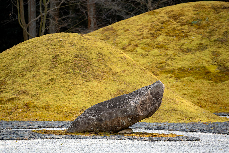 作庭家ではない宮司が設計した枯山水は、表参道と築山の具象的な要素と、立石による神を表現した抽象的な要素が組み合わさった前衛的なものだ。